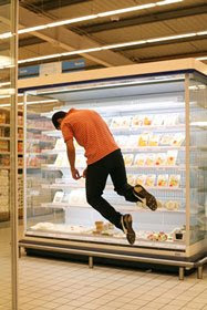 Sterker dan La Chute vind ik de serie Hyper uit 2007, waardoor mijn aandacht ook als eerste getrokken werd. Hier zijn het echt zwevende figuren geworden. Als bedwelmd zijn ze in een steriel aandoend decor van hypermarché’s geplaatst. Een omgeving vol consumptiegoederen, waarin de menselijke figuren doelloos, als in gewichtloze toestand rondwaren.
