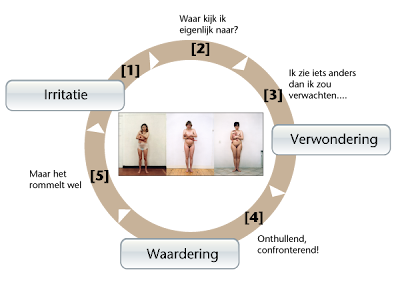 [4] De objectiverende benadering bewijst dat wat je feitelijk ziet totaal niet aansluit bij de gevoelens die je verondersteld wordt te hebben. Het duurt wel even voordat je dat doorhebt, maar dan gaat dit gevoel ook niet meer weg. Het besef dat beeld en werkelijkheid zo uit elkaar kunnen lopen is onthullend en confronterend. Je gaat je afvragen hoe dat in andere situaties is.